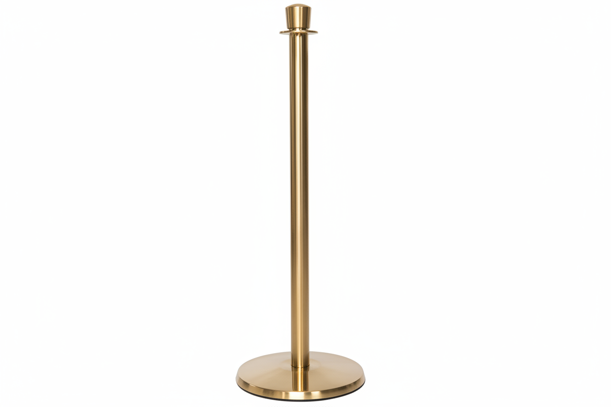 Poste y Barrera de cuerda Flexibarrier -Premium Crown Top- en acabado satinado plata o latón con un peso de 11.5kg (!). Flexibarrier Premium es seguro gracias a su base baja, que evita que sus visitantes tropiecen o caigan sobre la barrera. La solución perfecta para crear una cola fuera de su club o restaurante.