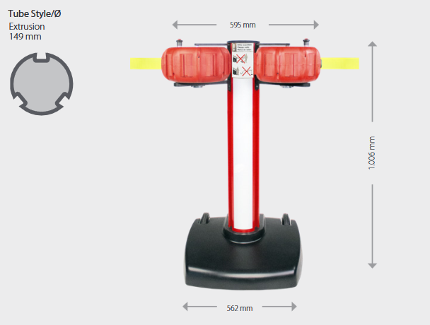 Barrera de aluminio y acero. 2 x 25 metros de cinta retráctil. Color: Elija entre amarillo neón, rojo-blanco o negro-amarillo. Peso total: aprox. 55 kg Altura: aprox. 1000 mm Base: 562 mm