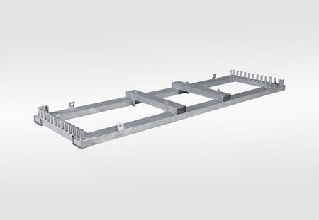 Palé de transporte de alta resistencia fabricado en acero galvanizado, diseñado para alojar hasta 30 paneles de valla de obra (3.5 m). Construido para el almacenamiento, la manipulación y el transporte eficientes de sistemas de vallado en obras o áreas de evento.