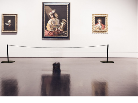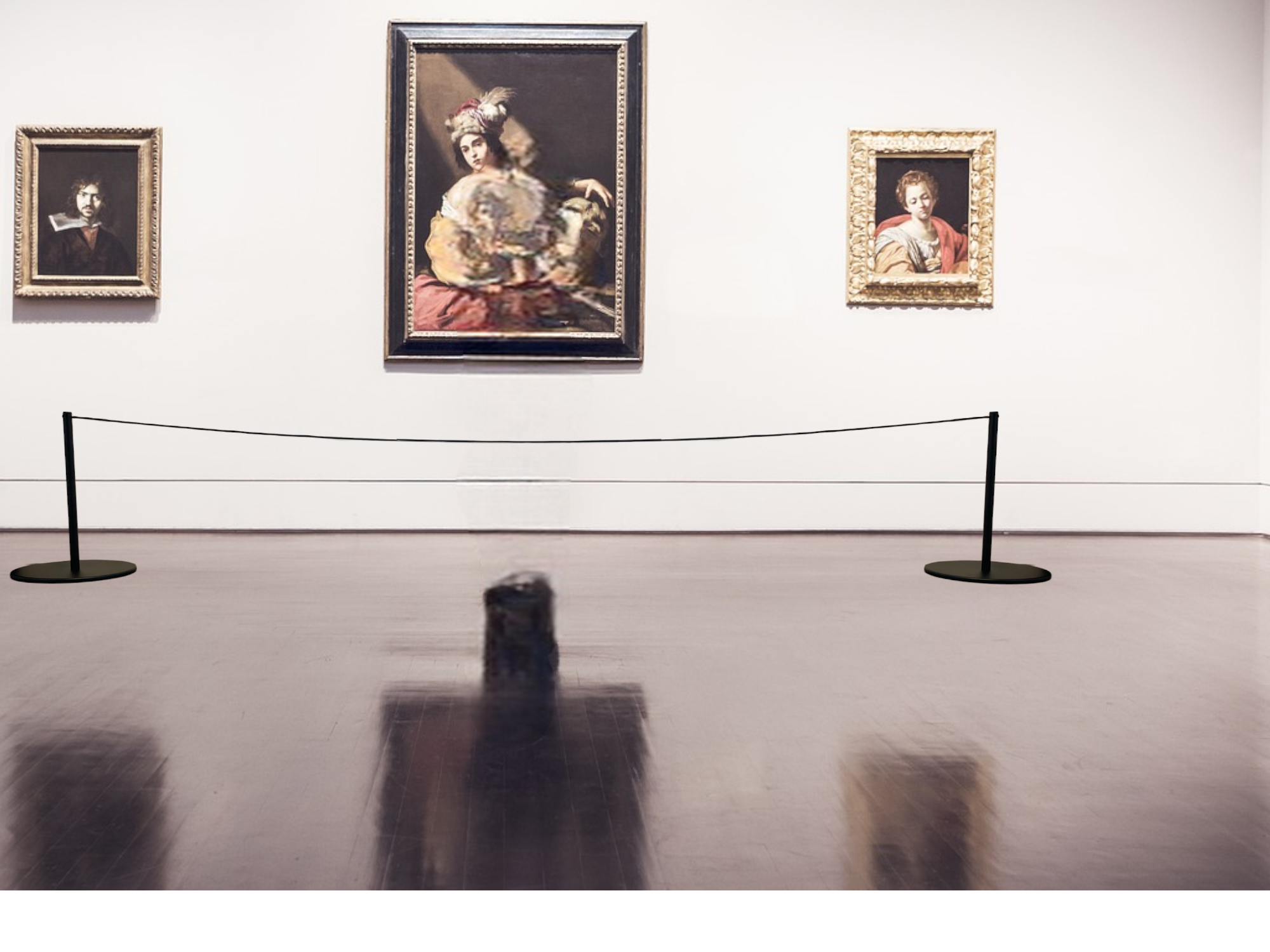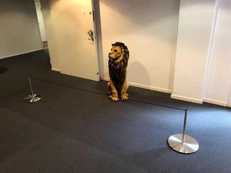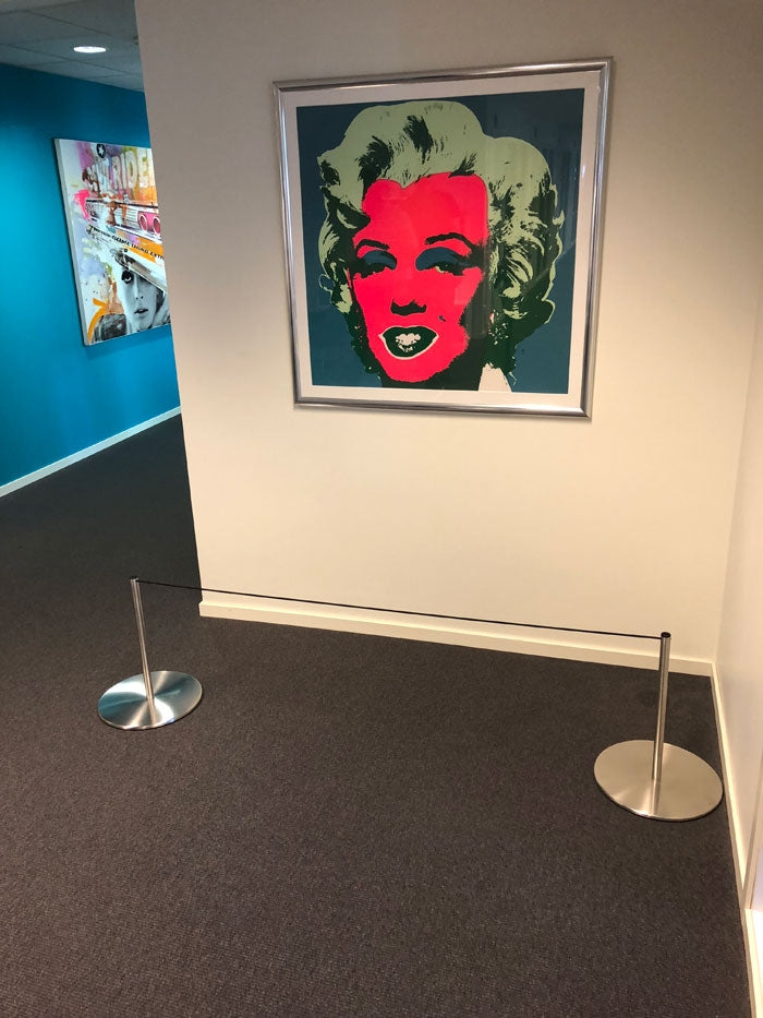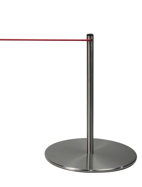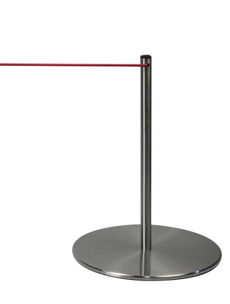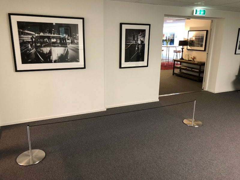 Un elegante poste de delimitación para museo con cierre, en cromo cepillado o negro, que junto con un cordón elástico (se compra por separado) crea una delimitación en, por ejemplo, museos y galerías.