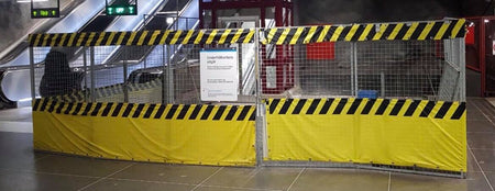 Cubierta de advertencia de alta visibilidad en amarillo y negro, diseñada para adaptarse a paneles de vallado temporal estándar (2m x 3.5m). Ideal para mejorar la seguridad y la visibilidad en obras de construcción y otras zonas restringidas.
